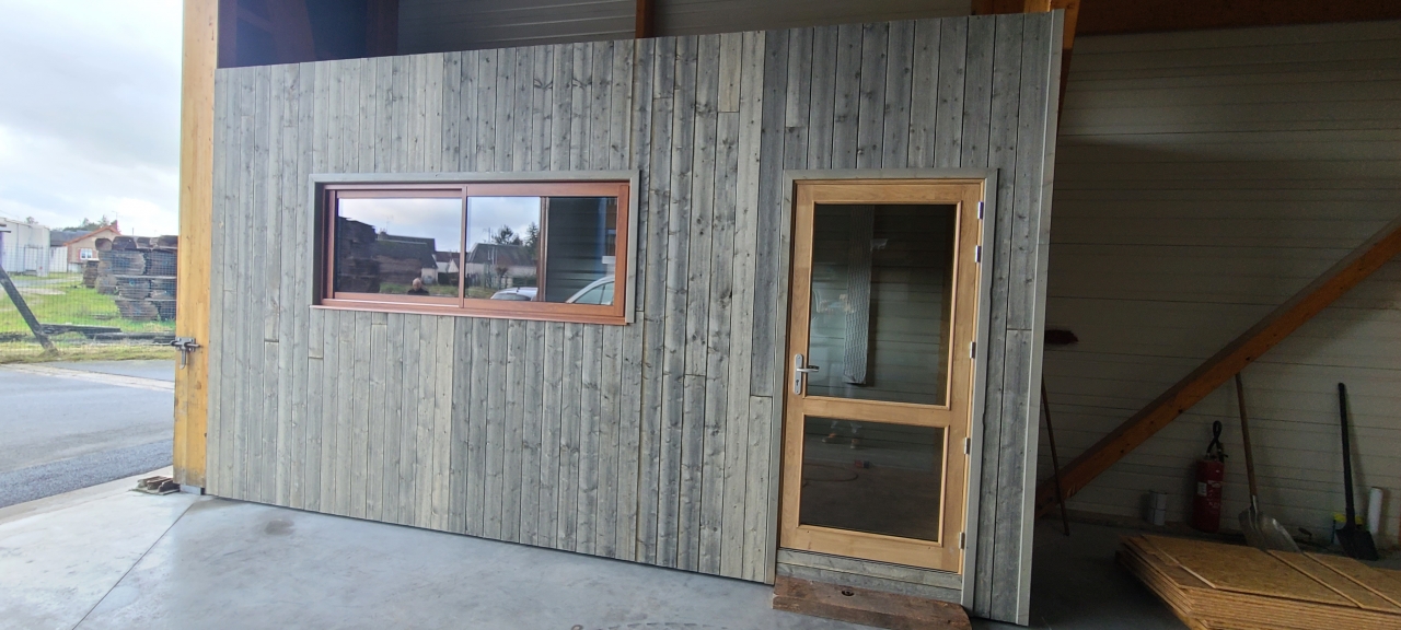 Bureau ossature bois bardage gris, isolation fibre de bois